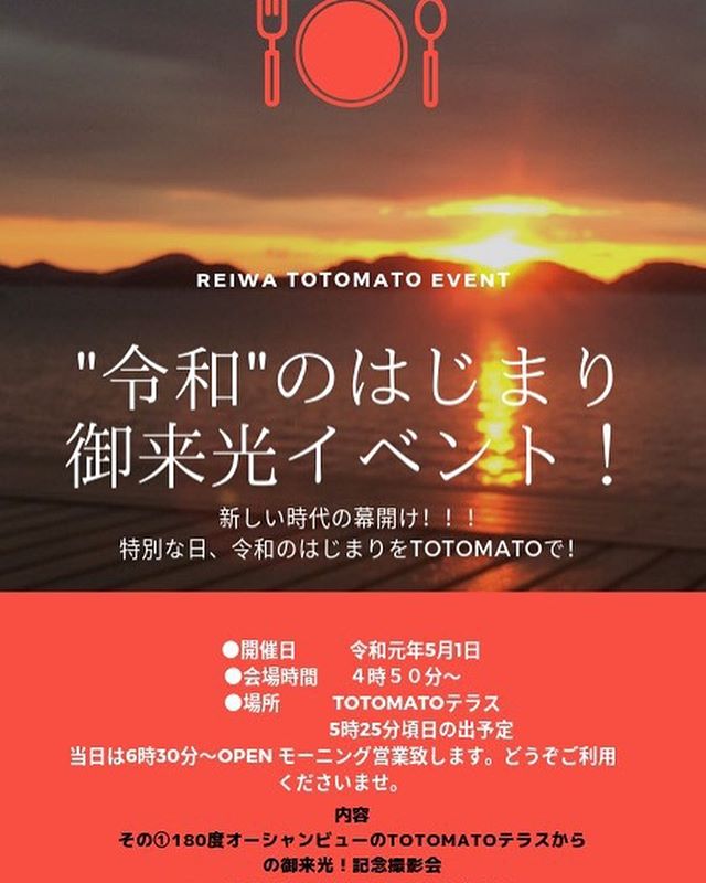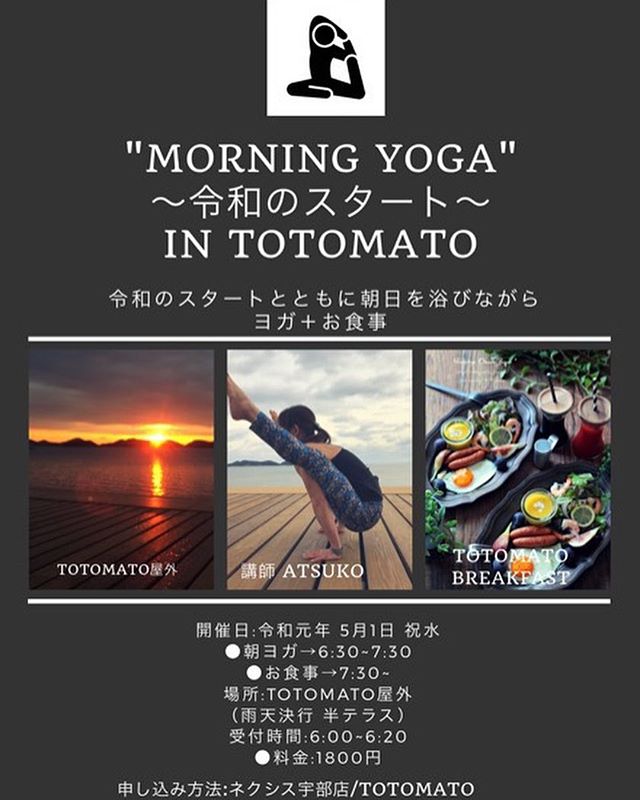 令和のスタートにTOTOMATO で気持ちの良い朝を迎えませんか? 今回は ATSUKO先生による屋外でのヨガを予定しております。TOTOMATO ならではのロケーションの中で行うヨガを是非、体験してみてはいかがでしょうか? ブレックファースト付きで1800円。 お申込みは ネクシス宇部 TOTOMATO の2か所で行ってます。 さぁー今すぐご連絡を!